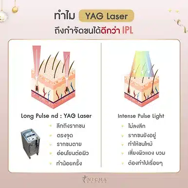 โดยเลเซอร์ที่ใช้จะมีผลในการทำลายเฉพาะรากขนไม่ให้ขนใหม่ขึ้นมาอีก และทำให้บริเวณที่ใช้เลเซอร์กำจัดขน ดูเรียบเนียนมากขึ้น
