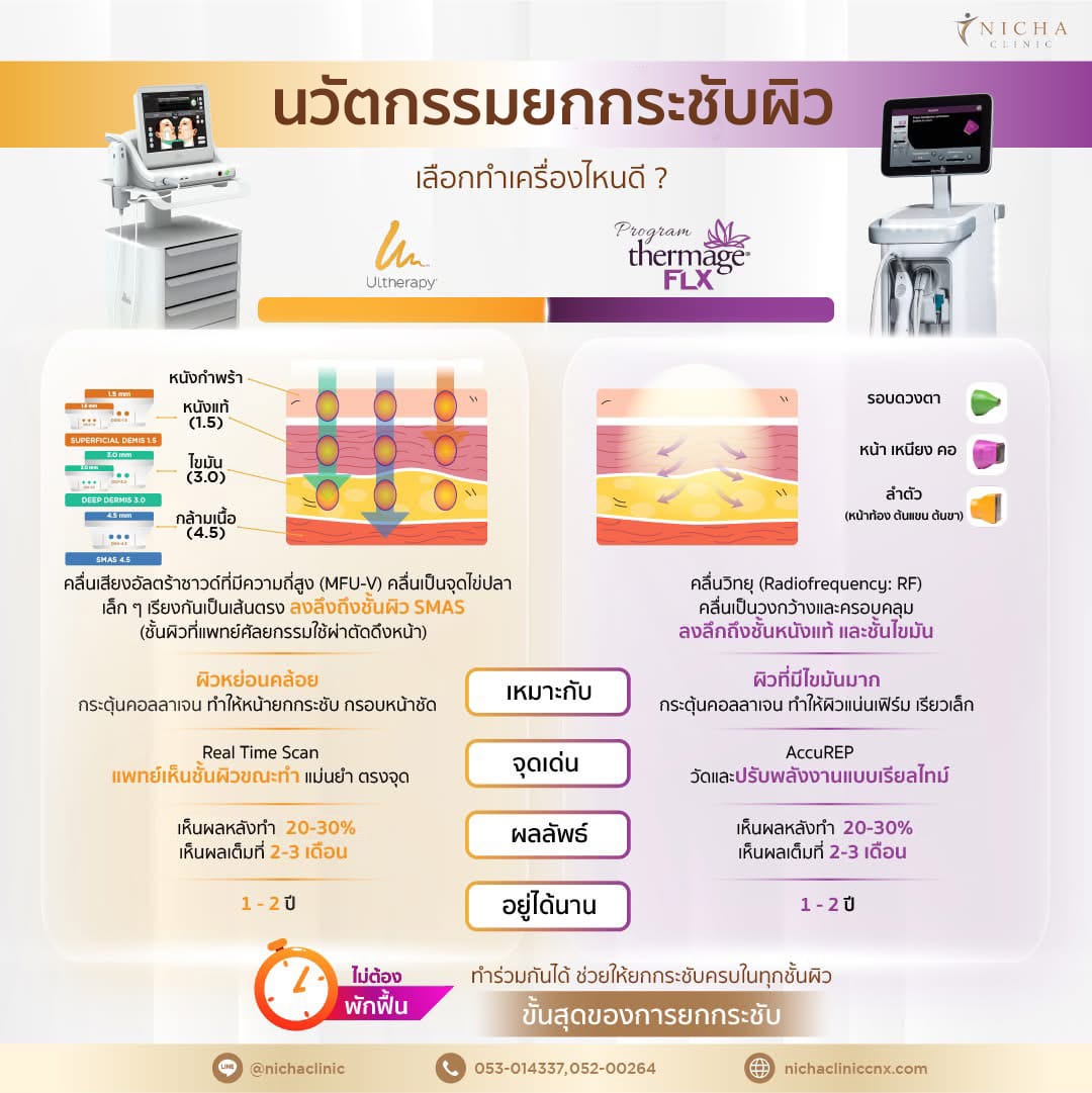 หลายๆคนมีข้อสงสัยเกี่ยวกับเครื่องมือ/ วิธีการที่ช่วยยกกระชับผิวหน้า และคอ ไม่รู้จะเลือกทำแบบไหนดี? ยังไม่อยากพึ่งเข็มหรือไม่อยากทำศัลยกรรม เทคโนโลยีเหล่านี้ ไม่ว่าจะเป็น Program Ultherapy / Program Thermage แล้วเครื่องมือสองสิ่งนี้ต่างกันยังไงนะ ? เรามาไขข้อสงสัยกัน